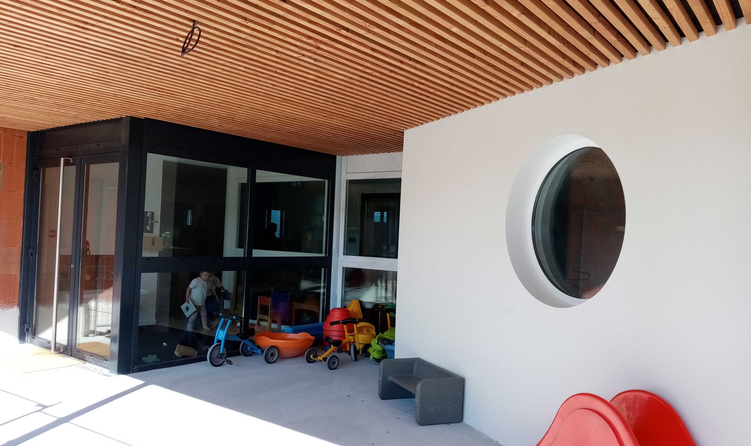 2 groupes d’âge sont accueillis dans un grand bâtiment rénové. Extérieur facile d’accès, espace de jeu, potager, poulailler…