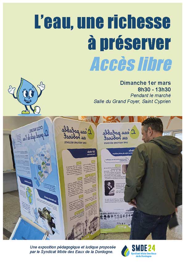 Le Syndicat Mixte des Eaux de la Dordogne (SMDE 24) propose une exposition exceptionnelle dédiée à la thématique de l’eau ce dimanche 1er mars, en accès libre, dans la salle du Grand Foyer à Saint‑Cyprien, en parallèle du marché hebdomadaire.