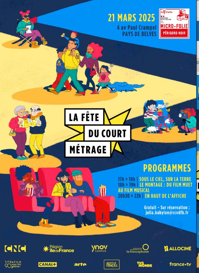 Le Vendredi 21 mars – 17h > 22h 4 avenue Paul Crampel, Saint-Cyprien 17h > 18h | SOUS LE CIEL, SUR LA TERRE | 5 titres pensés spécialement pour le jeune public : de l’aventure, de l’émotion, du rire. À partir de 3 ans 18h > 19h | LE MONTAGE : DU FILM MUET AU FILM MUSICAL | On parle de la magie du cinéma mais savez-vous comment elle opère ? Panorama (non exhaustif) sur l’histoire de la fabrique des émotions par le montage. À partir de 8 ans 20h30 > 22h | EN HAUT DE L’AFFICHE | Chiara Mastroianni, Melvil Poupaud, Jalil Lespert, Marina Foïs, Jean-François Stévenin, Bastien Bouillon, Juliette Armanet… Retrouvez-les dans des univers tous courts ! À partir de 12 ans Tout public | Sur réservation Gratuit – Sur réservation : julia.babylon@ccvdfb.fr