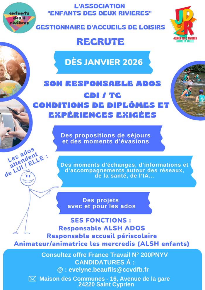 Dès janvier 2026, l’association Enfants des Deux Rivières, gestionnaire d’accueils de loisirs, ouvre ses portes à un(e) Responsable Ados en CDI temps complet, afin de développer des projets innovants et renforcer l’accompagnement des jeunes sur le territoire.