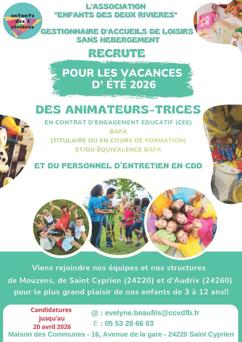 L’association Enfants des Deux Rivières, gestionnaire d’accueils de loisirs sans hébergement, ouvre sa campagne de recrutement pour les vacances d’été 2026.
